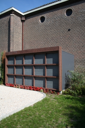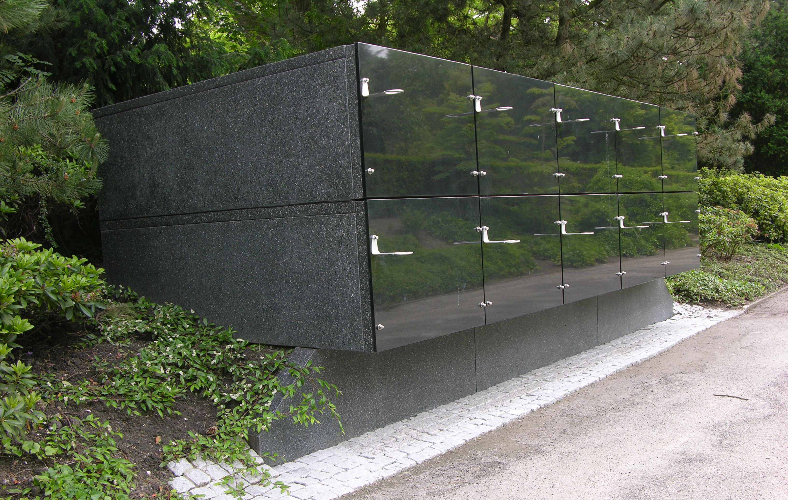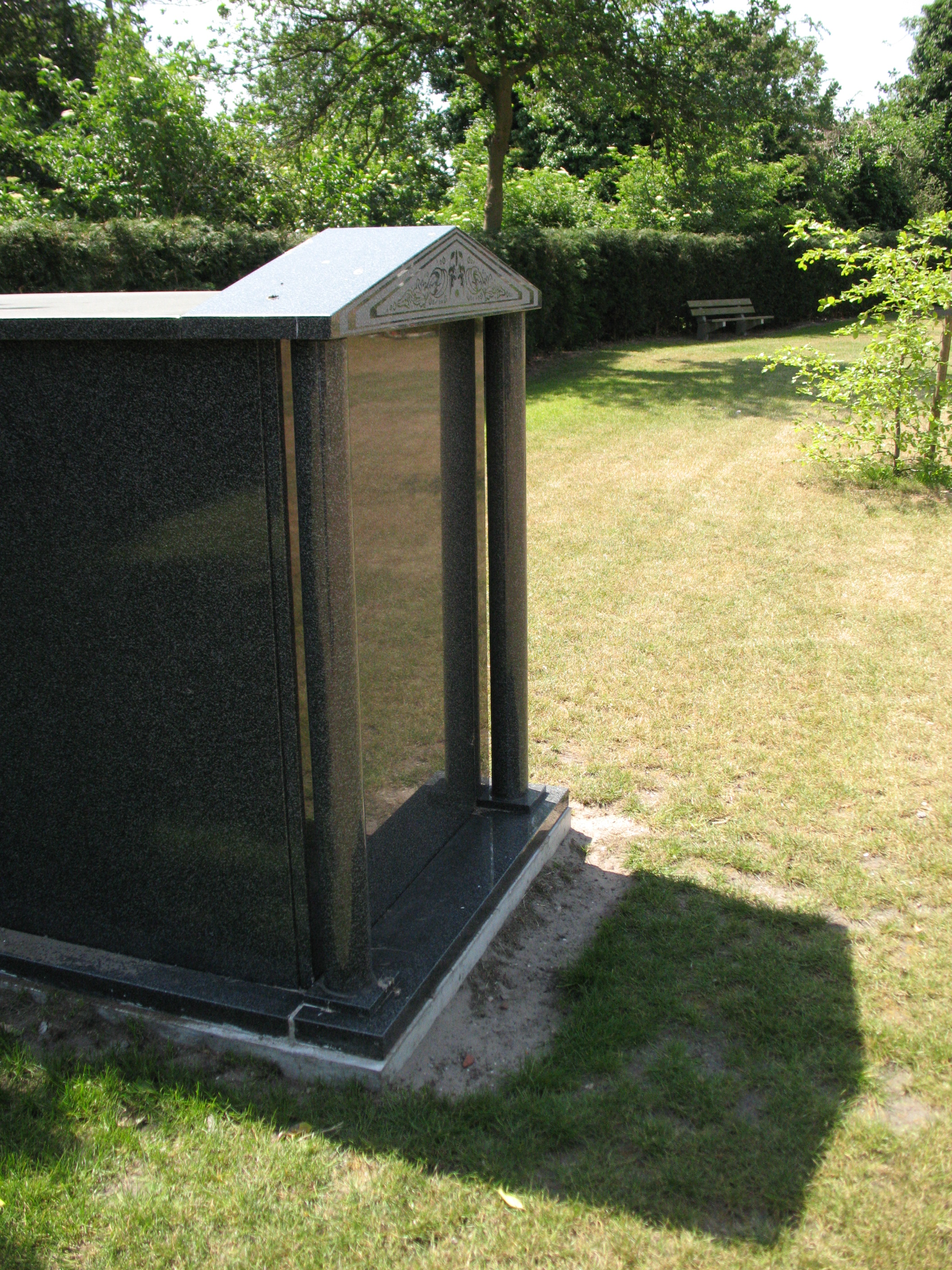 De voorzijde is qua omlijsting uitgevoerd met Impala (graniet) gezoete balken en lijsten. De gedenkplaten zijn wit/grijs graniet evenals de zijwanden van de galerijgraven, waarop een tekst is aangebracht. De onderzijde is tevens met Impala graniet verfraaid.