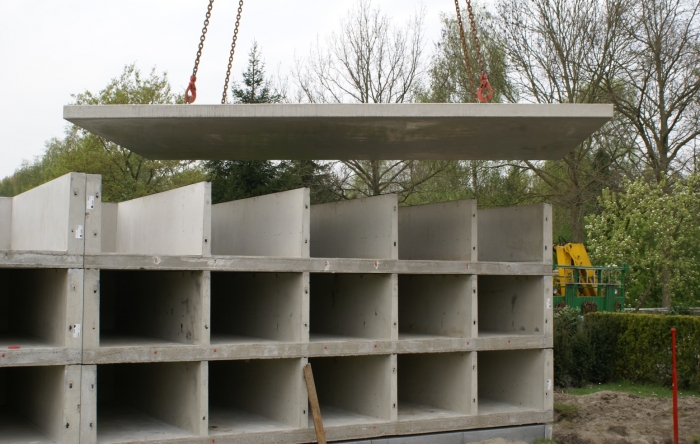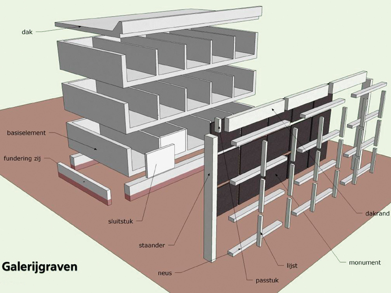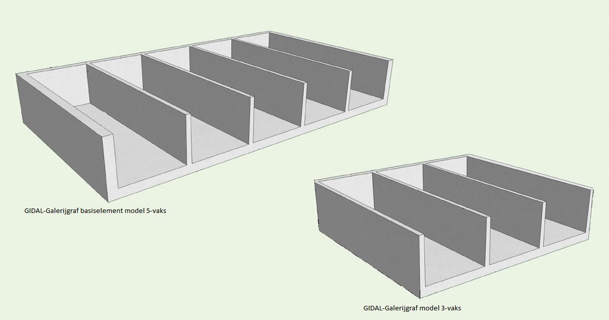 Het standaard element met 5 stuks Galerijgraven kan in diverse lagen worden gestapeld, waarna een dakplaat zorgt voor de bovenste afsluiting. Het grote oppervlak van de bodem zorgt ervoor dat zelfs bij een stapeling van 3-hoog een geringe grondspanning ontstaat, zodat ook op minder draagkrachtige grond zonder fundering een zettingsvrije constructie is gewaarborgd.