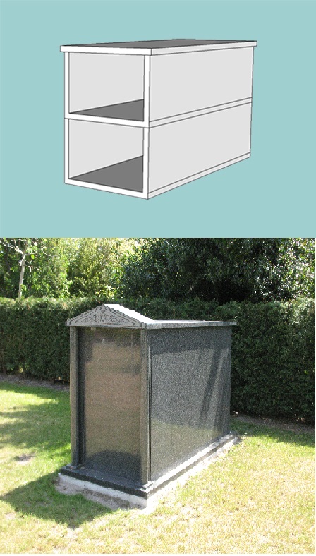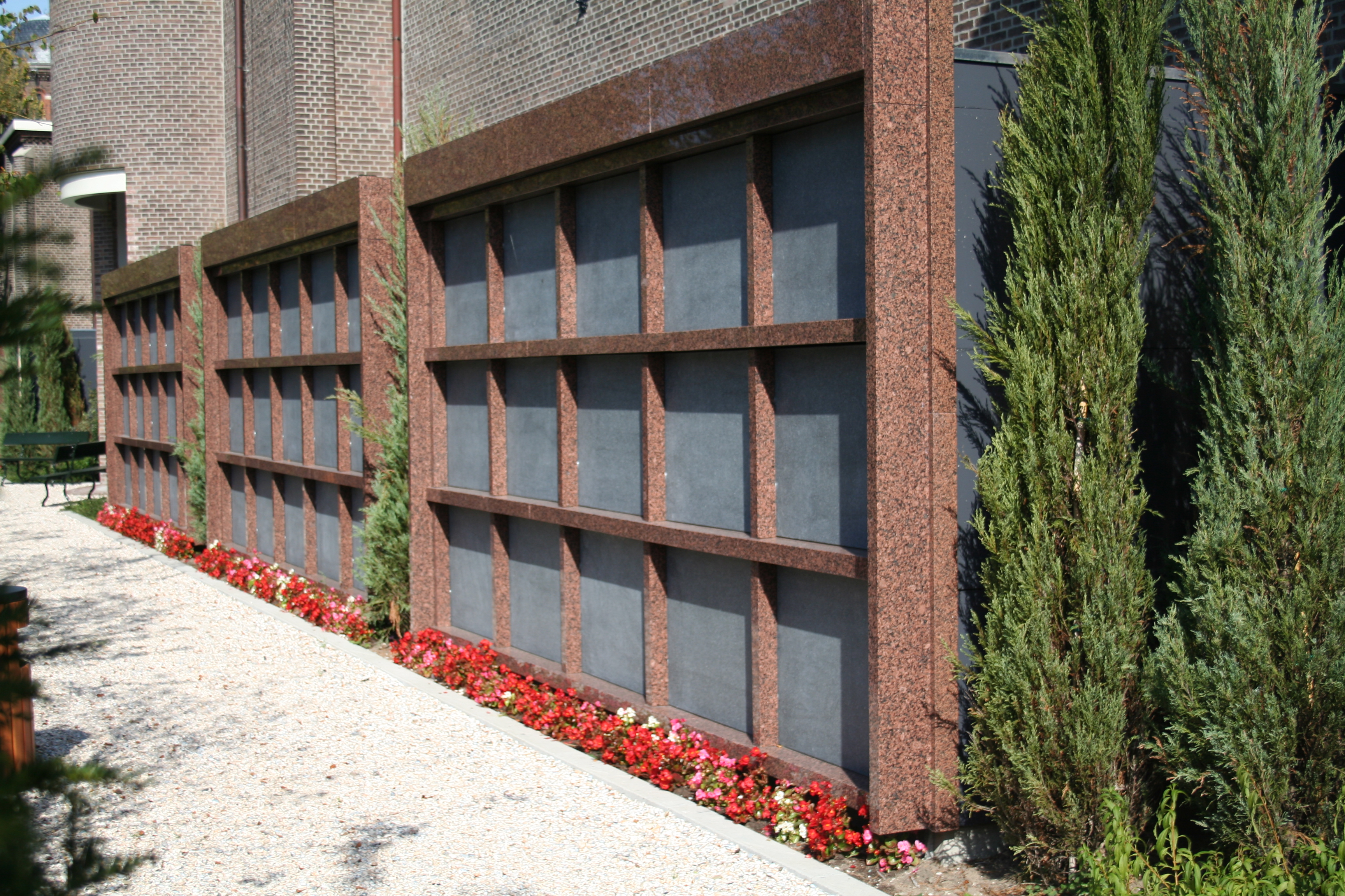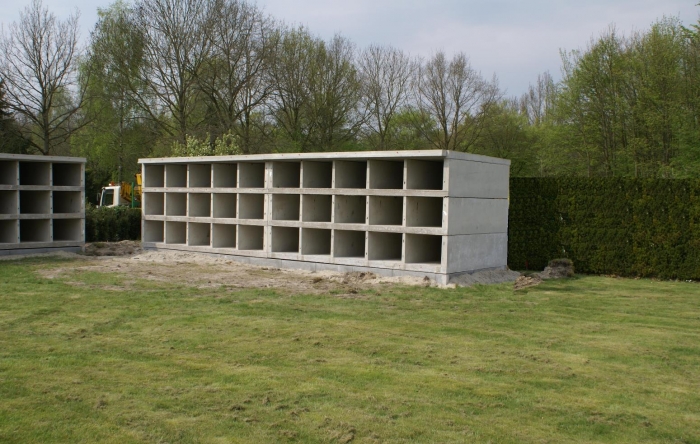 De elementen worden standaard in grijze beton geproduceerd maar kunnen indien gewenst ook in een kleur en/of andere oppervlakte bewerking uitgevoerd worden. Voor het fraaiste eindresultaat adviseren wij echter een bekleding met natuursteen. De elementen worden standaard 5 graven breed en 3 hoog gestapeld. Tevens is de mogelijkheid van 2 vaks of 1 vak breed te plaatsen, welke op hun beurt weer 1, 2, 3 of zelfs 4-hoog kunnen worden opgebouwd. Normaal gesproken verzorgen wij hierbij de gehele plaatsing en volledige montage inclusief het natuursteen.
