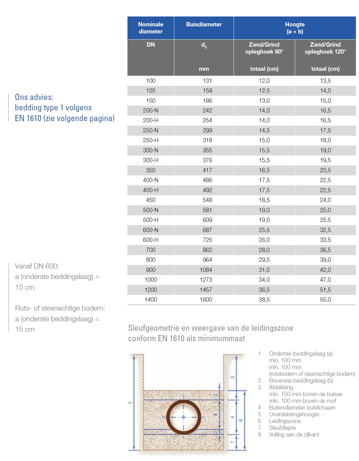 De mechanische verdichting gebeurt in lagen van 15 tot 30 cm. Voor gresbuizen gelden de volgende regels: bij korrelgroottes van > 40 mm in de eerste te verdichten aanvullingslaag moet de afdekking minstens 300 mm dik zijn.