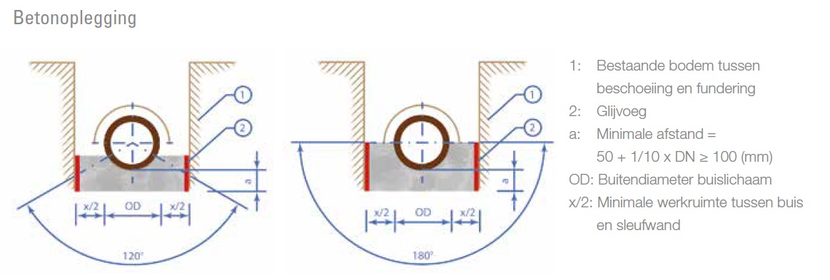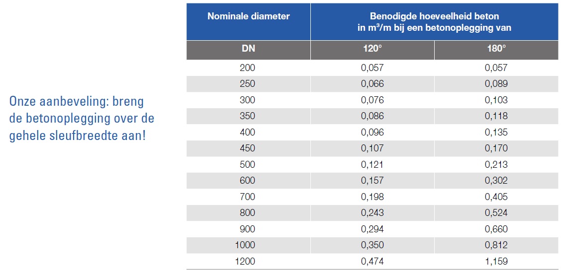 In speciale gevallen wordt als beddingsmateriaal hydraulisch gebonden bouwmateriaal (b.v. niet-gewapend of gewapend beton) gebruikt. Doorslaggevend voor het gebruik van een betonnen oplegging kunnen zowel constructieve maatregelen als statische randvoorwaarden zijn. Betonoplegging met een opleghoek van 90°, 120° of 180° moet beantwoorden aan de voorwaarden van het inbeddingstype 1 volgens EN 1610. De breedte wordt aan de hand van maat a (a = 10 cm + DN/10) of de sleufbreedte bepaald.