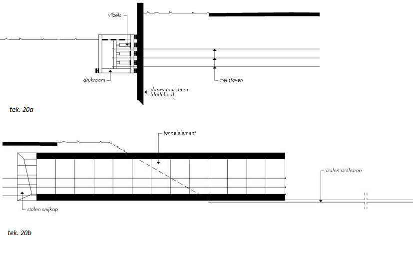 Vervolgens werd het tussengelegen gedeelte en de beide beëindigingen op de gebruikelijke wijze aangebracht. Met voorspankabels werd het geheel aan de getrokken delen bevestigd, zodat een complete koker ontstond.