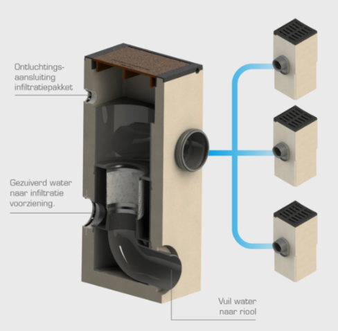 Deze infiltratievoorziening krijgt dan schoon water aangevoerd en gaat niet meer dicht slippen. Het vuil wordt afgevoerd met een klein gedeelte van het water naar de vuilwaterafvoer.