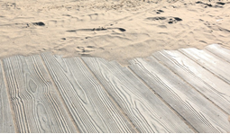 Strandopgang Comfortplaten zijn hoogwaardige betonplaten voorzien van een (fijne) oppervlaktestructuur die onderling worden gekoppeld. Deze onderlinge koppeling middels een kunststof strip zorgt voor een naadloze overgang zonder hoogteverschillen.